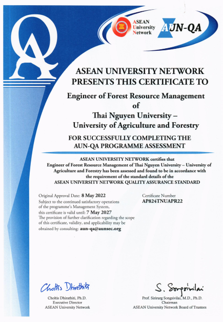 Ngành QUẢN LÝ TÀI NGUYÊN RỪNG - ĐH NÔNG LÂM THÁI NGUYÊN chính thức đạt chuẩn ANU-QA.
